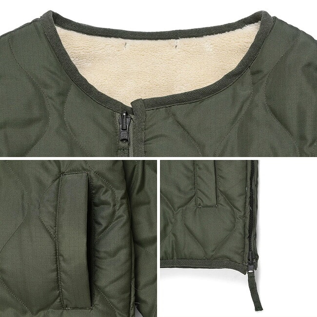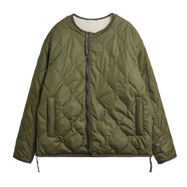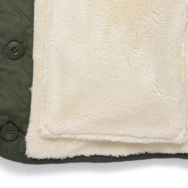 表側には、丈夫なリップストップ生地を使用し、保温性に優れた800FPのダウンを採用、ヘチマキルトのダウンステッチでミリタリー感を演出。裏側には、毛羽感のあるボアを採用し、防寒性も担保。