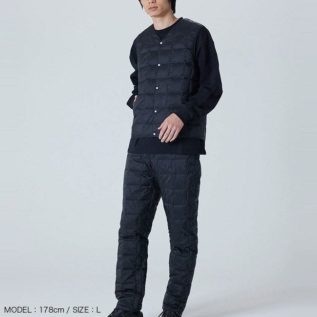 TAIONの定番、ベーシックインナーダウンは、気軽に履ける、軽くて暖かく着回しやすいシンプルなデザインが特徴です。嵩高が高く、保温性の高い800FPダウンを使用。