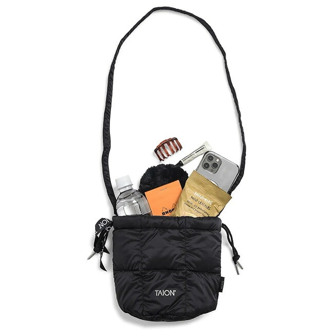 800FPダウンを使用し、軽くて柔らかなフォルムが特徴的。見た目はコンパクトながら、スマートフォン・財布・鍵・化粧品など、必要な小物がしっかり収納可能。
