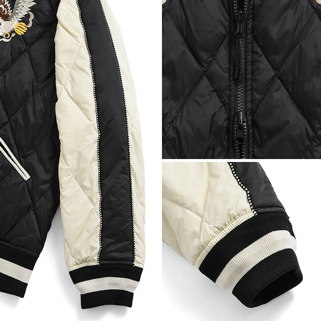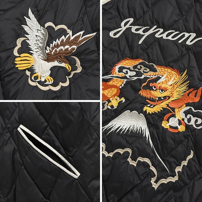 表側は、ダイヤキルトで左右胸に鷲と後ろには龍のスカジャン刺繍を。