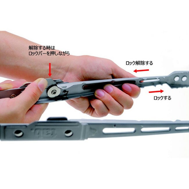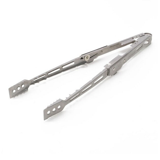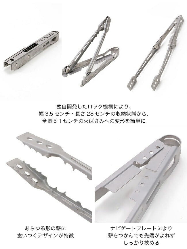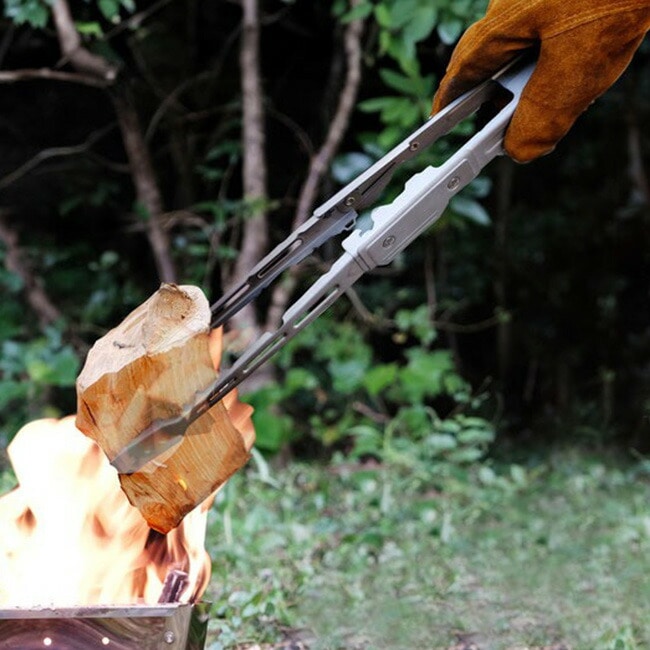 エクストングは全長51cmの焚き火トングです。アーム部分が回転し、折りたたむことで長さ28cm幅3.5cmというスリムサイズになります。