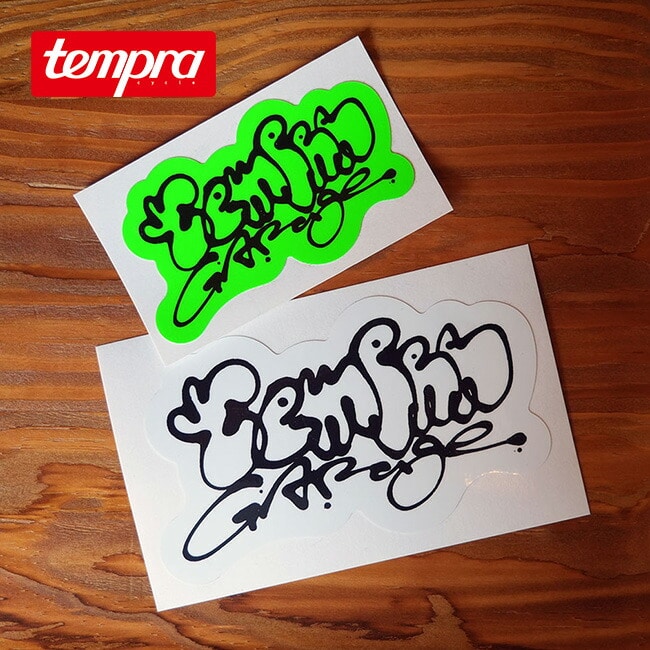 大きい方は白地に黒のベーシックなデザイン、小さい方はtempraらしさ全開の蛍光グリーンに黒。
