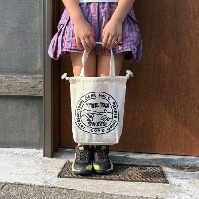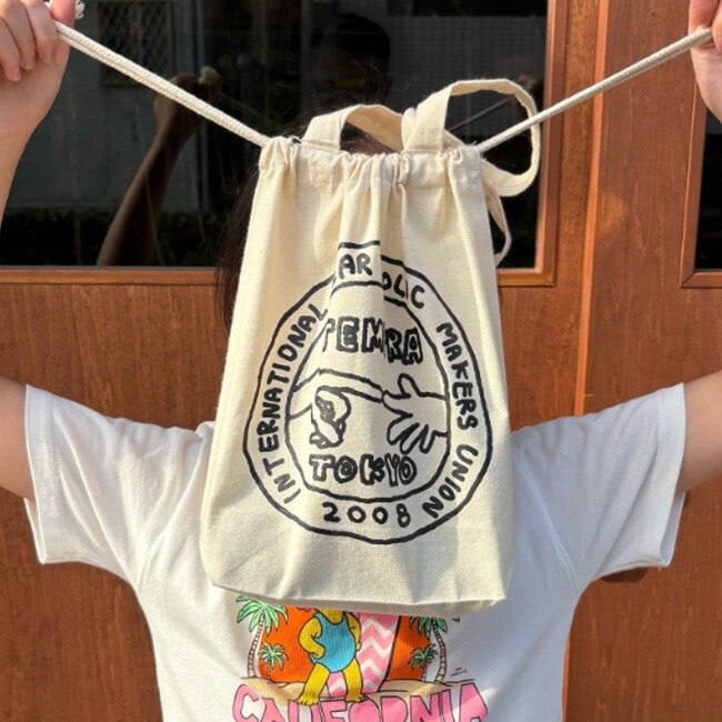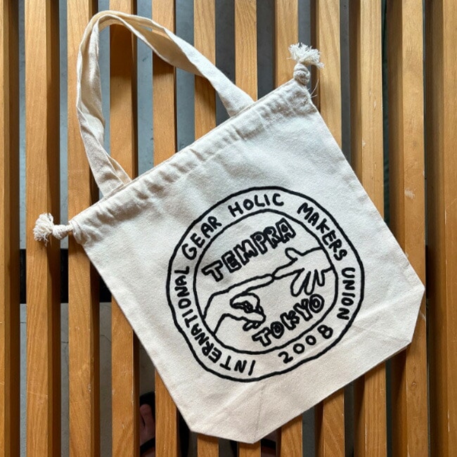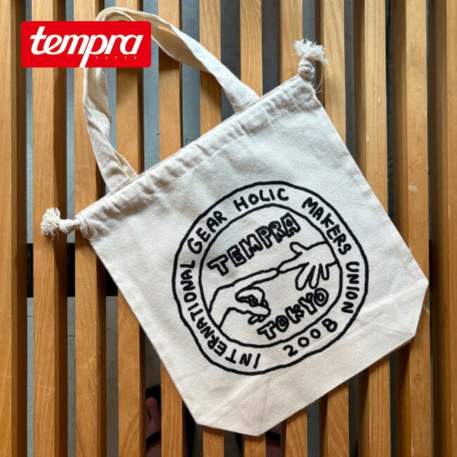 tempraのアイテムでも人気を誇るナカムラルイ氏によるPOPUPのために描き下ろした、tempra garageシェイクハンドロゴのユーモアあふれるイラストのプリントが施されています。