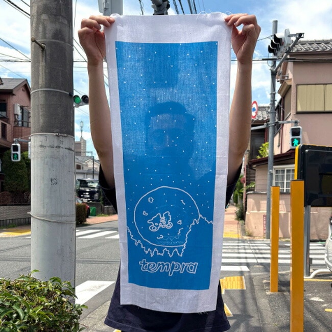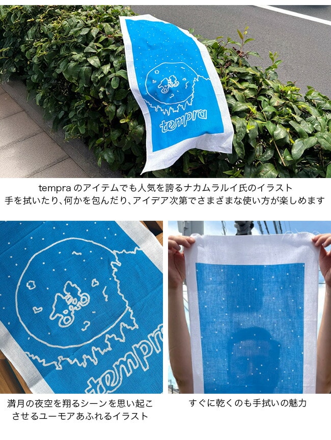 ナカムラルイ氏のPOPUPのために描き下ろされた、満月の夜空を翔るシーンを思い起こさせるユーモアあふれるイラストを手拭いにしました。