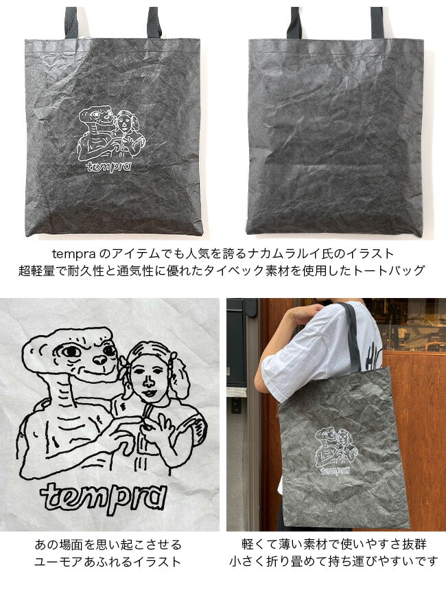 tempraのアイテムでも人気を誇るナカムラルイ氏による、ユーモアあふれるイラストをプリントしたタイベックトートバッグです。