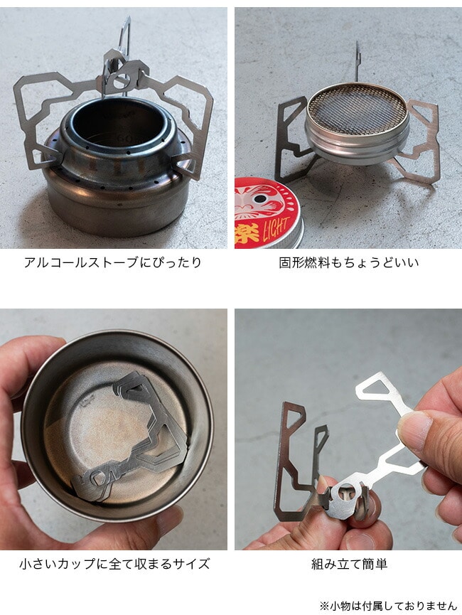 お湯を沸かすだけの1dayのツーリングやトレッキング、TiNYの五徳なら小さいカップ一つに全てが収まります。