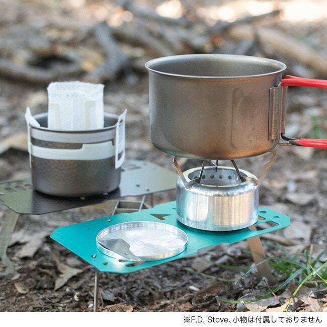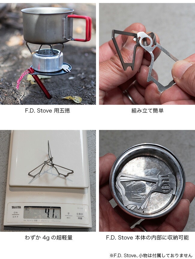 それでいて、F.D. Stove の内部にぴったり収納できる独自設計のため、ストーブ・固形燃料・五徳をひとまとめにしてクッカーへスタッキング可能です。