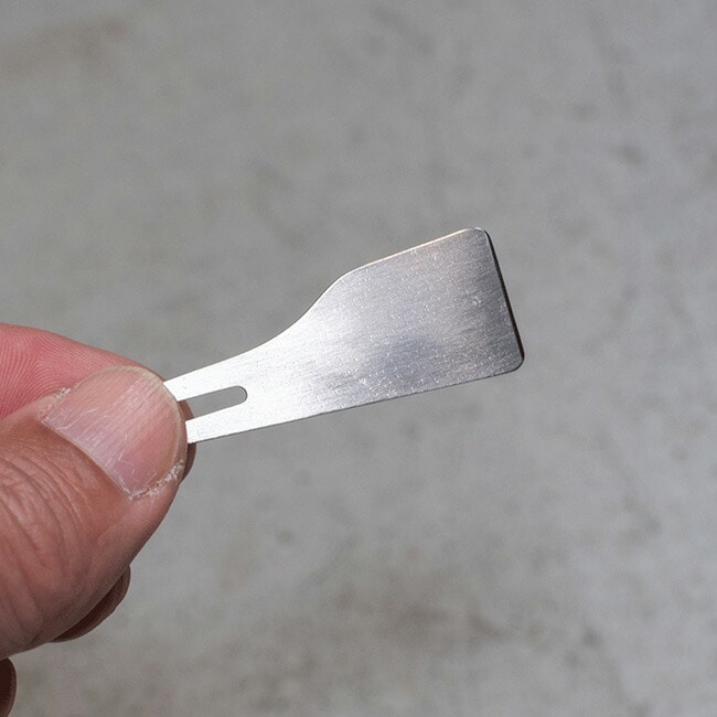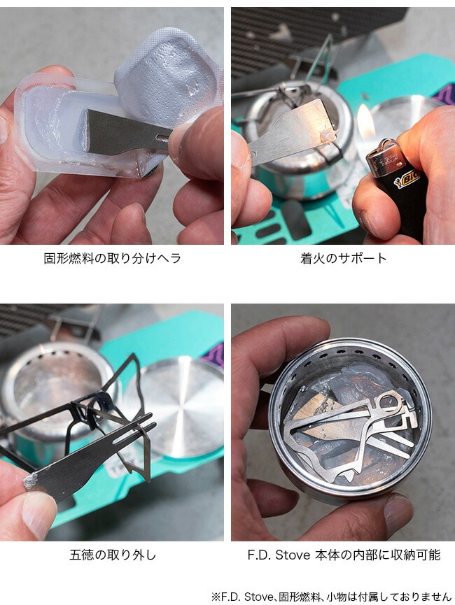 固形燃料 FIRE DRAGON を取り分けるヘラとしてはもちろん、五徳をセットした F.D. Stove への着火サポート、炎で高温になった五徳の取り外し、燃焼後に F.D. Stove にこびり付いた燃えカスを削ぎ落とす作業など、さまざまなシーンで活躍します。F.D. Stove と組み合わせて使用することで、調理から後片付けまでをよりスムーズに行うことができます。