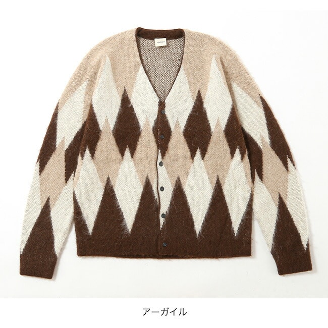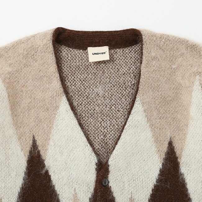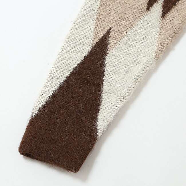 ペルーのアルパカを100%使用した、アーガイル柄が特徴的なクラシックスタイルのカーディガンです。天然色で染めないだけでなく、製品起毛により柔らかい着心地を実現しています。