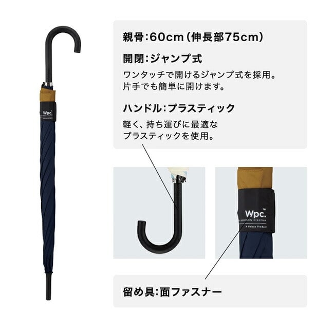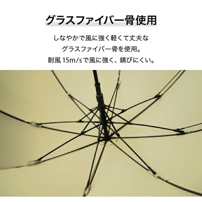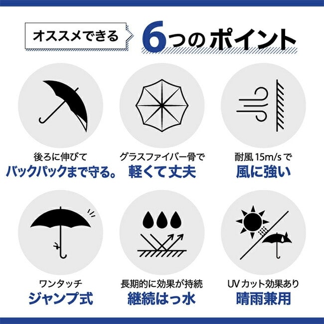 後ろに大きく広がって大事なバッグを雨から守るバイカラーの長傘。傘を開くと骨の一部がスライドして大きくなり、 背負ったバックパックを雨から守ります。