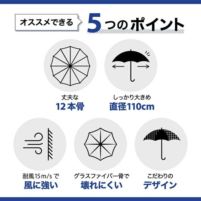 骨が多いほど壊れにくく耐風性に優れているため、おしゃれで丈夫な傘をお求めの方におすすめです。開いた時の直径は110cm、親骨サイズは63cmと男性でも安心のサイズ感。