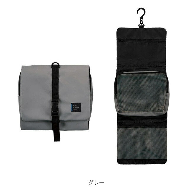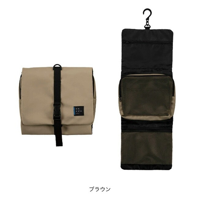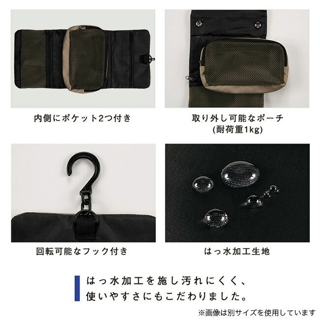 トラベルセットをまとめて収納できる、フック付きポーチ。洗面所などでそのまま吊り下げて使えます。