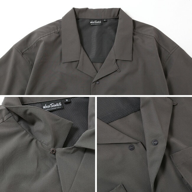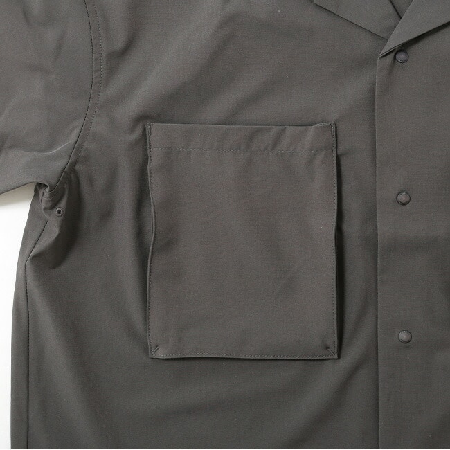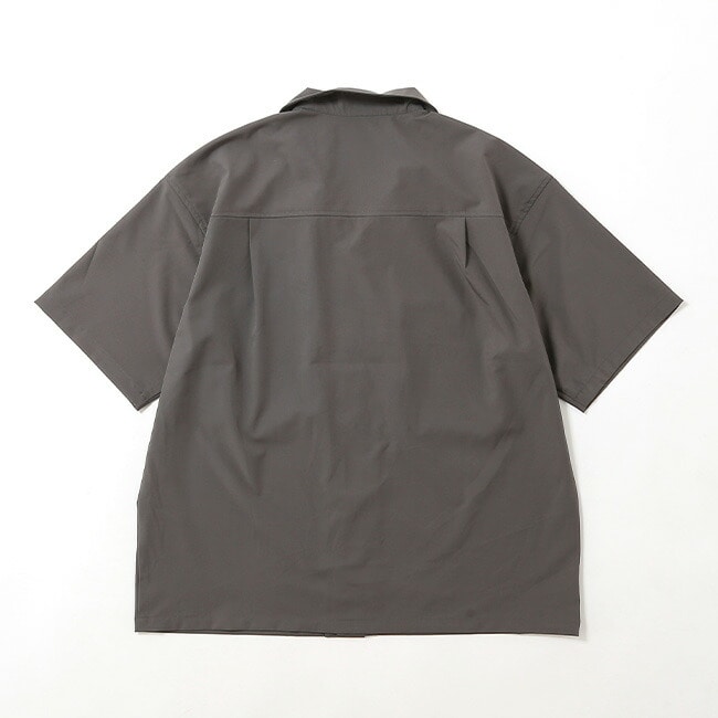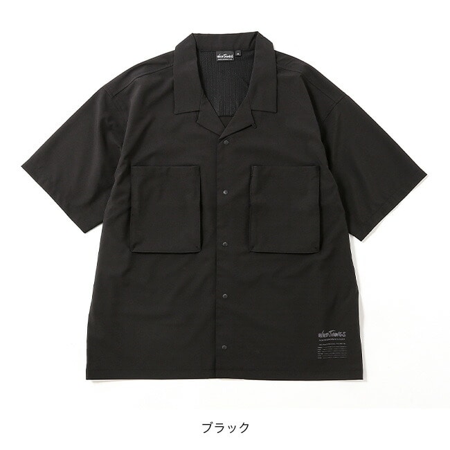 UVカットと吸水速乾性、微ストレッチを備えたポリエステルを使用したポケット付きオープンカラーシャツ。左裾にはミリタリータグをイメージしたプリント、右後ろにはシンプルなロゴプリント入り。