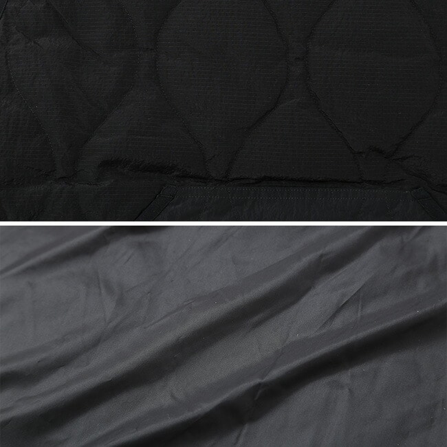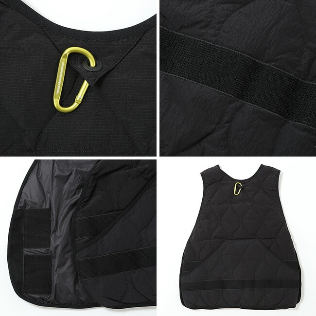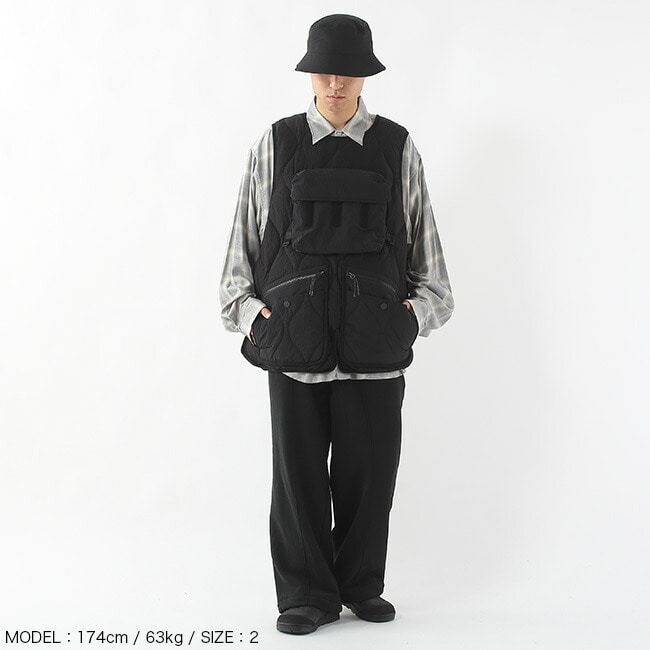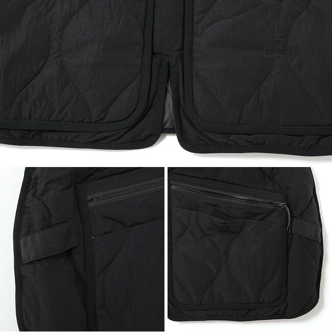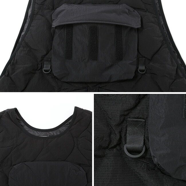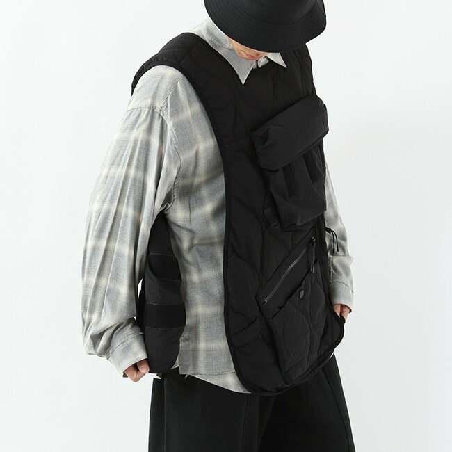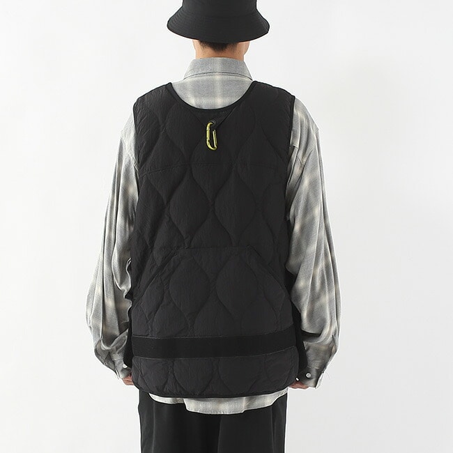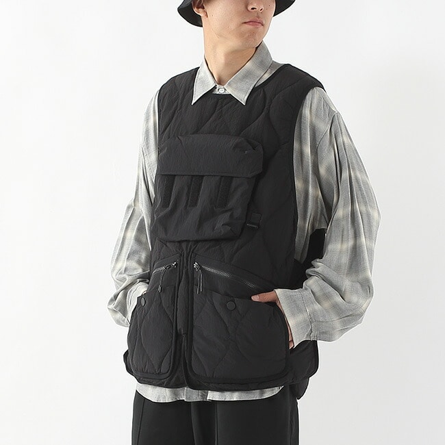 大きなポケットがアクセントのキルティングベスト。ナチュラルなシワ感が特徴の40Dリップストップ素材に撥水加工を施しています。