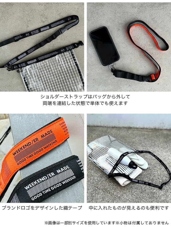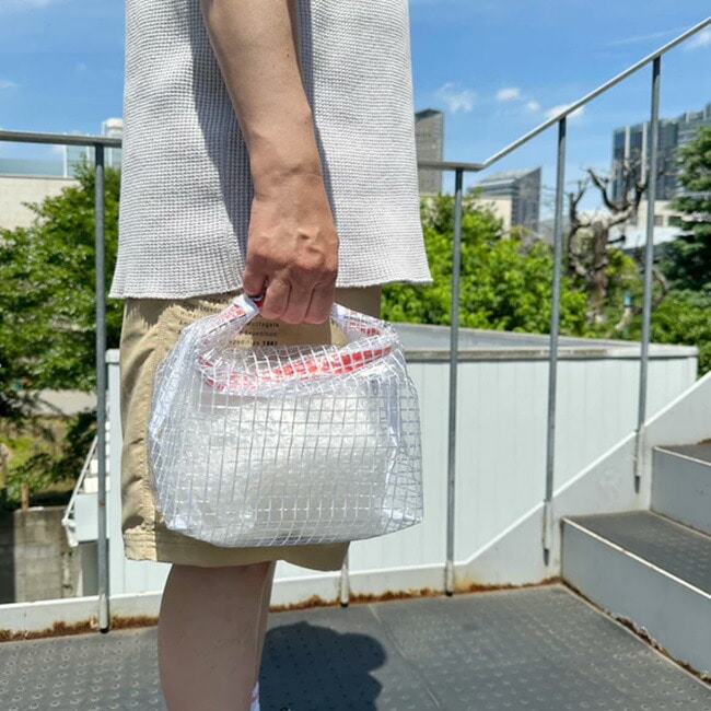 WEEKENDERでは定番のロールトップ式ケースを透明なグリッド生地で作りました。