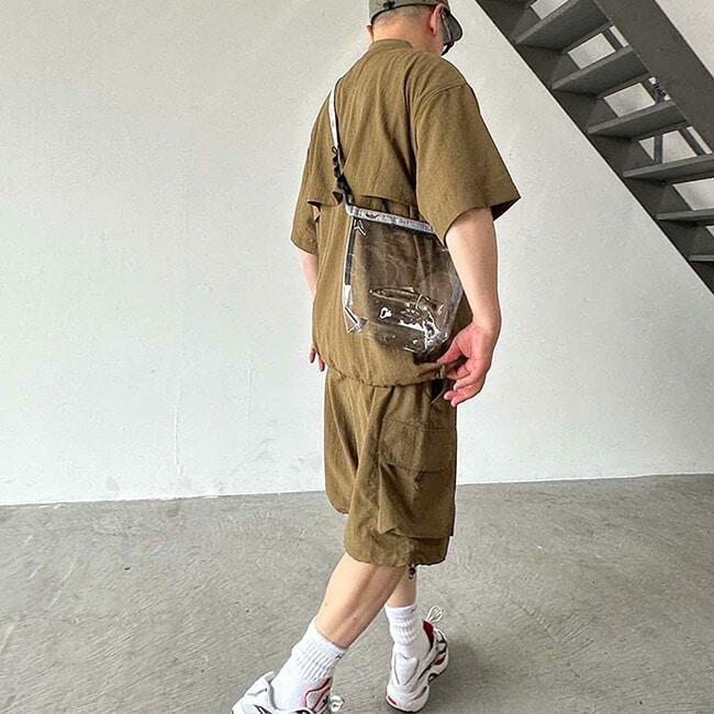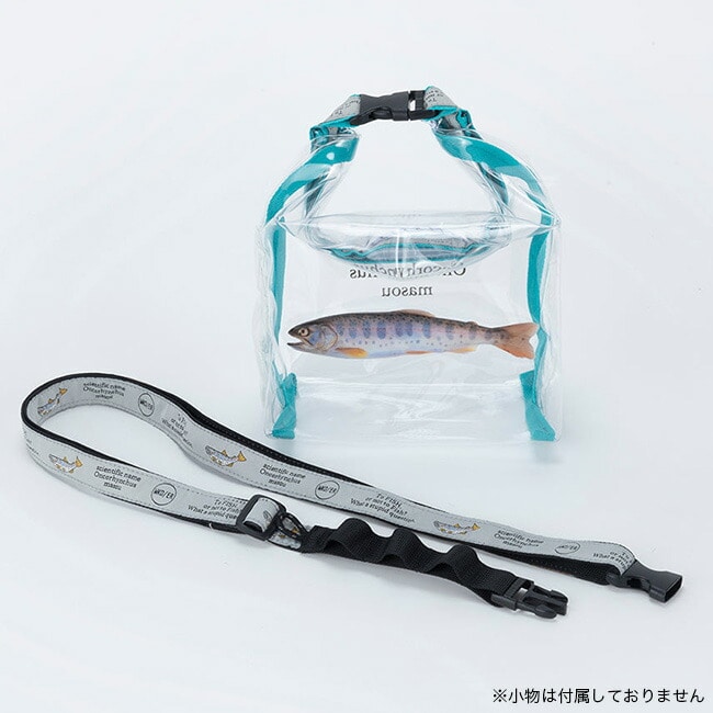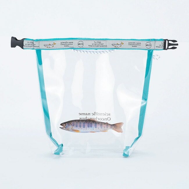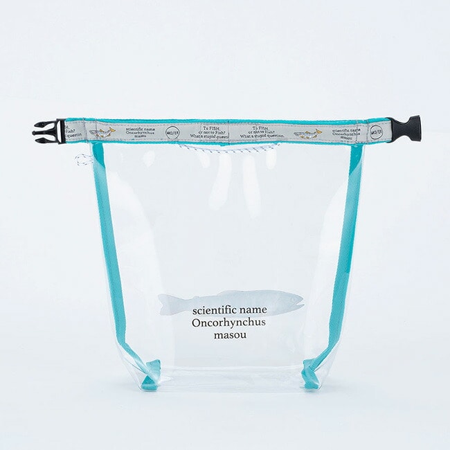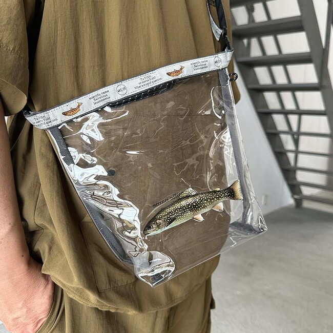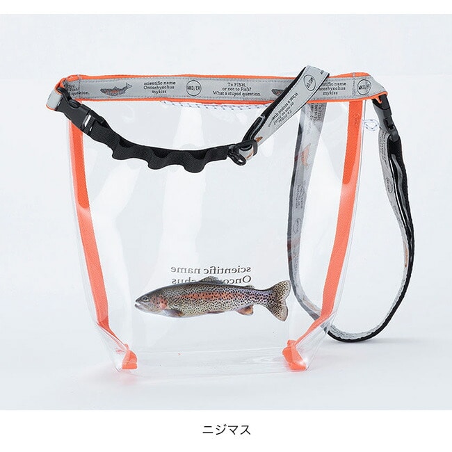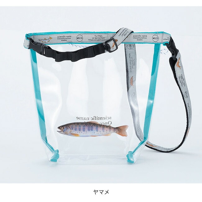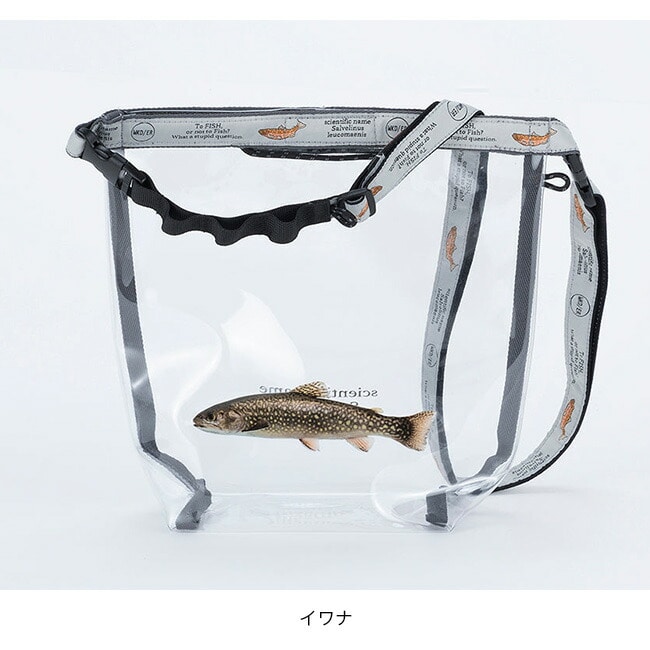 クリア塩ビ素材に人気の高い川魚をプリントしたロールトップ型ショルダーバッグ。
