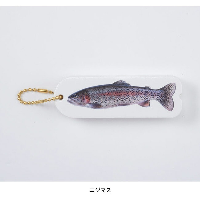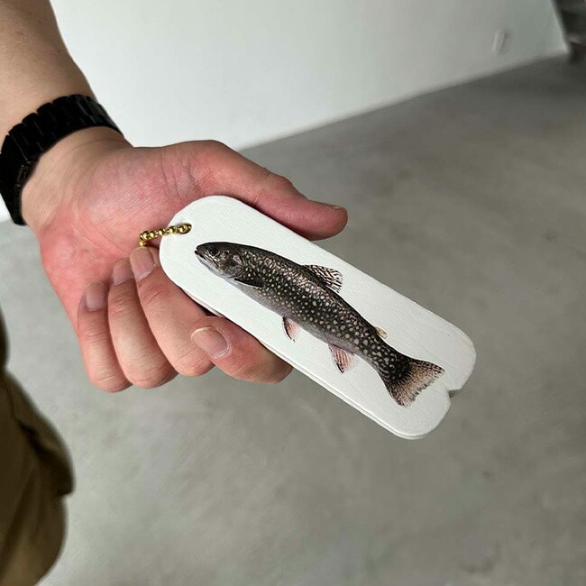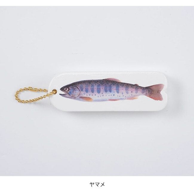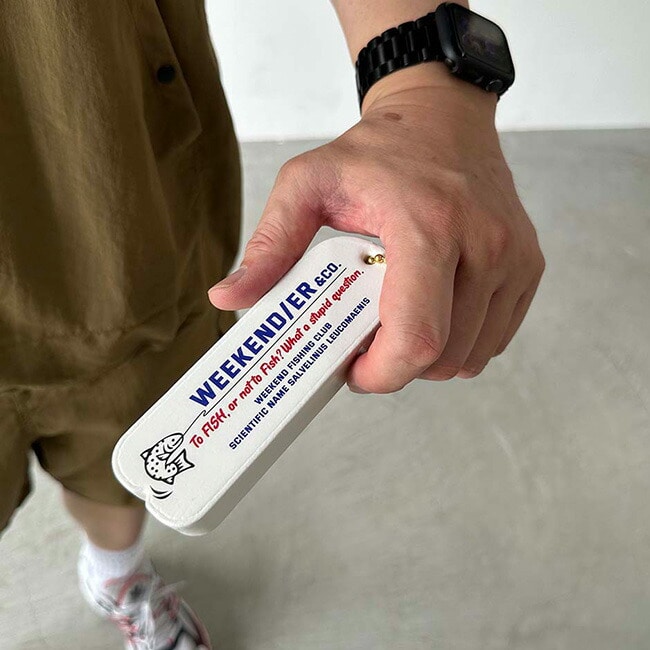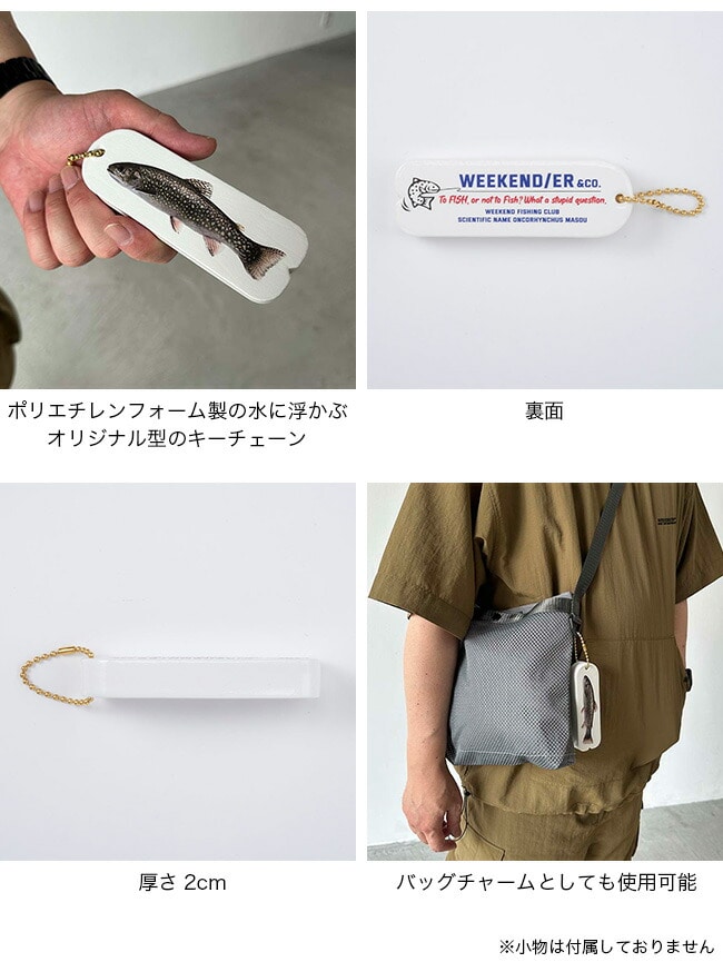 表面には人気の高い川魚3種をプリントし裏面にはWEEKEND(ER)らしいグラフィックをプリントしました。バッグのチャームとしてもキーホルダーとしても。