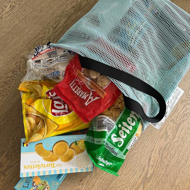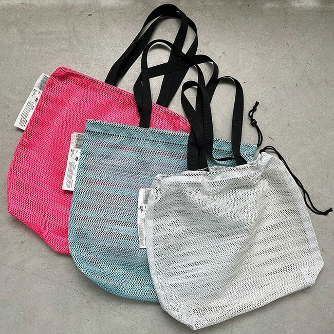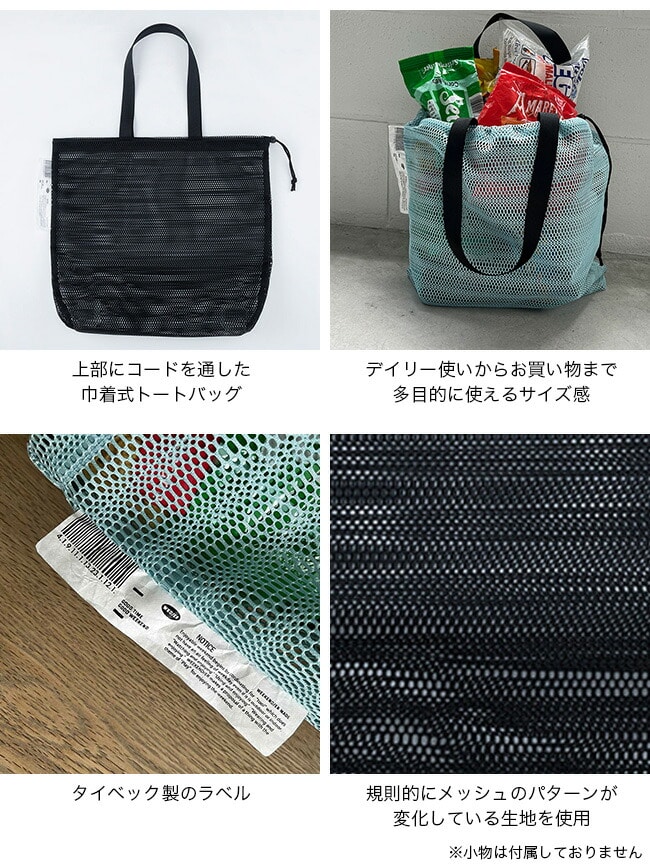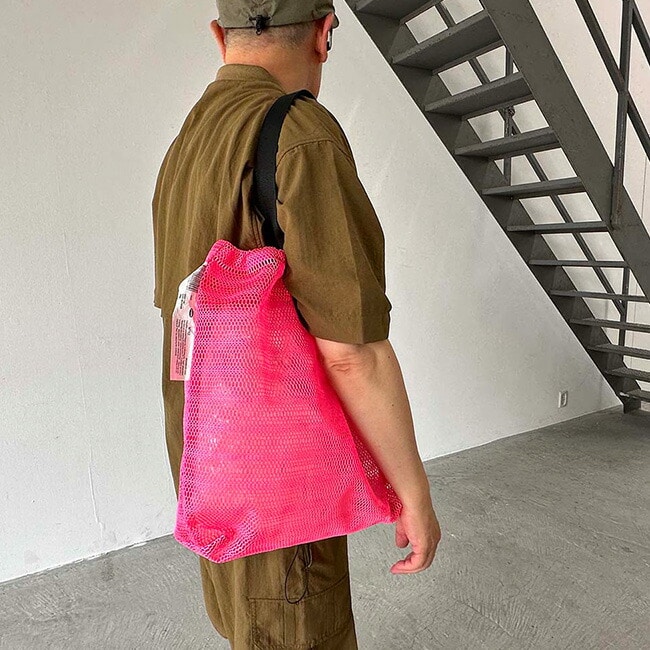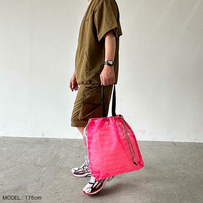 上部にコードを通した巾着式トートバッグ。デイリー使いからお買い物まで多目的に使えるサイズ感。