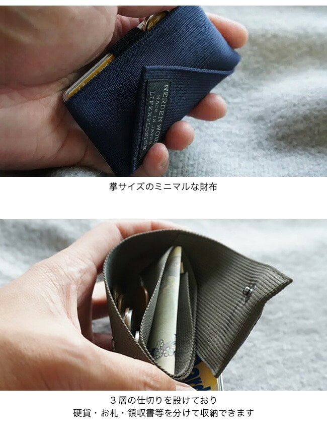 3層の仕切りを設けており、硬貨・お札・領収書等を分けて収納する事ができる、ミニマルな財布。
