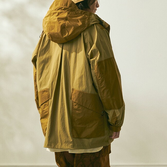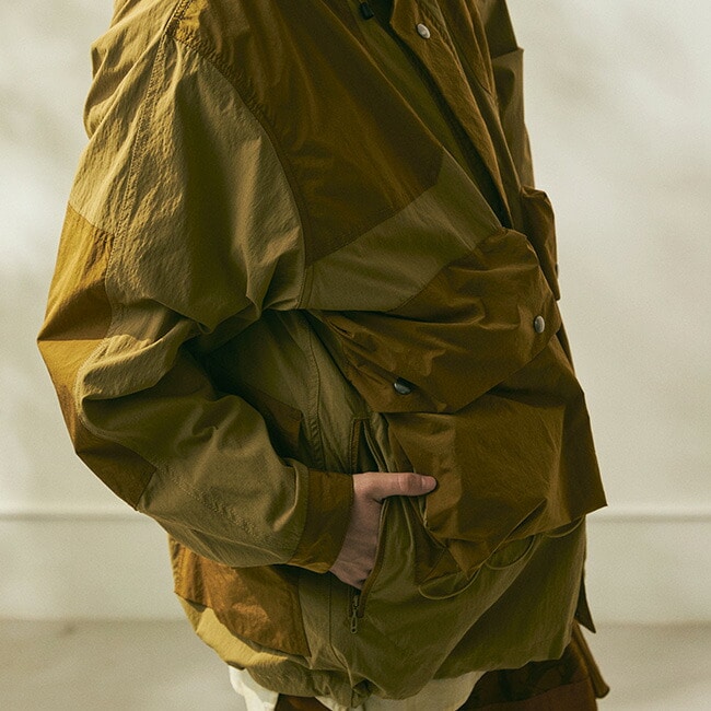 フロントの大きなボックスポケットにはストレッチ性の無いナイロンリップ生地を使用するなど必要な生地の特性をパーツにより使い分けているのも大きな特徴です。