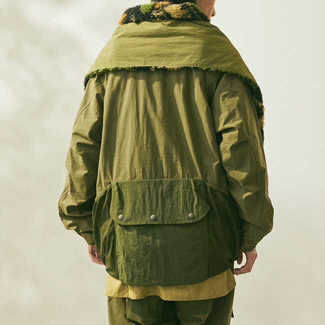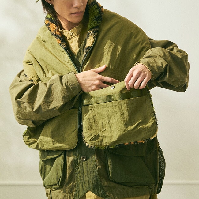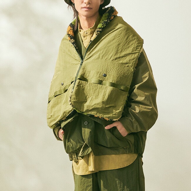 マフラー先の大きなポケット、テープホルダーなどのギミックによりジャケットの上からの重ね着時にベストとしての着こなしも楽しめます。