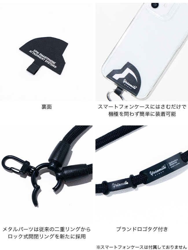 ※スマートフォンケース底面が穴のタイプに対応します。スマートフォンケースの形状によって使えない場合がございます。柔らかく、スマートフォンとケースのフィット感の弱いケースは、アタッチメントがずれて使用できない場合がございます。付属の両面シールをEPMスマートフォンアタッチメントシステムに貼り付けてご使用ください。