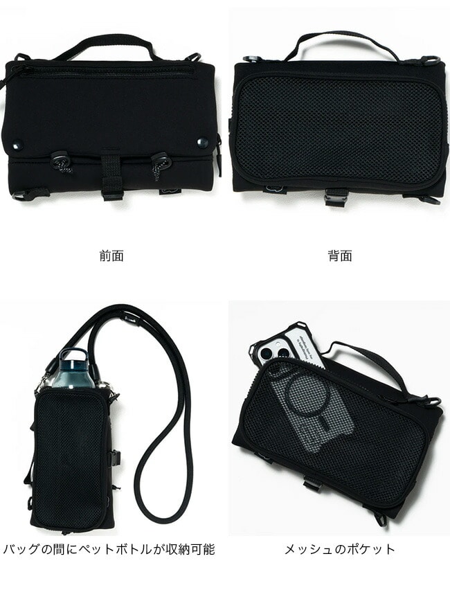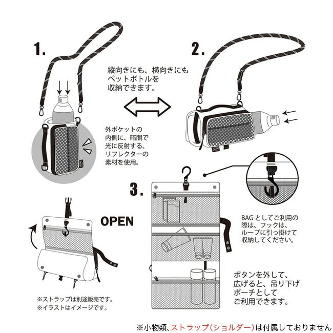 外ポケットのメッシュの下に、夜道での車のライトなどで反射するリフレクター素材を使用。バッグの間にペットボトルが収納でき、横にも縦にもショルダーとして持ち方を変えて使えます。