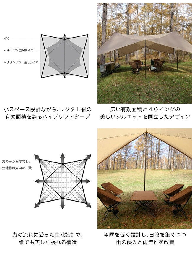ヘキサ型タープよりもコンパクトに設営できる設計ながら、レクタ型Lサイズに匹敵する使用空間を実現し、効率よく日陰や雨除けスペースを作り出します。