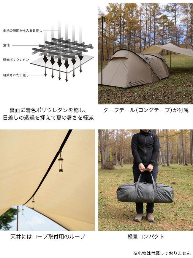 また、テントと重ねて設営できるタープテールを備え、限られたスペースでも柔軟なレイアウトが可能です。