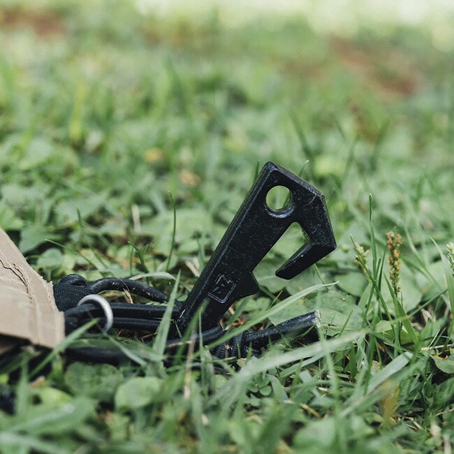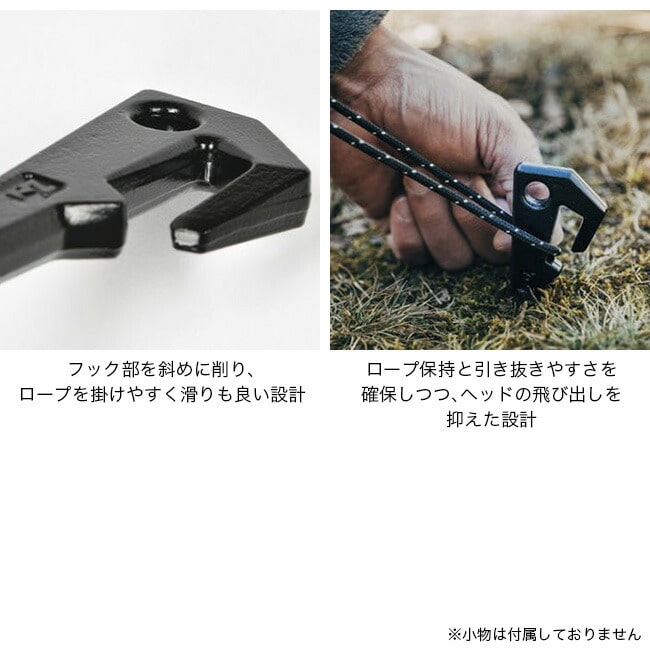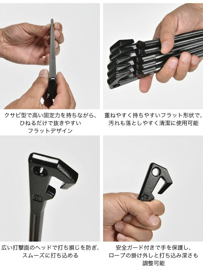 ヘッド部分はハンマーの打撃を受け止めやすく打ち損じを防ぎ、ロープを掛けやすい形状や安全ガードも備わっているため、設営時の使い勝手と安心感が高められています。