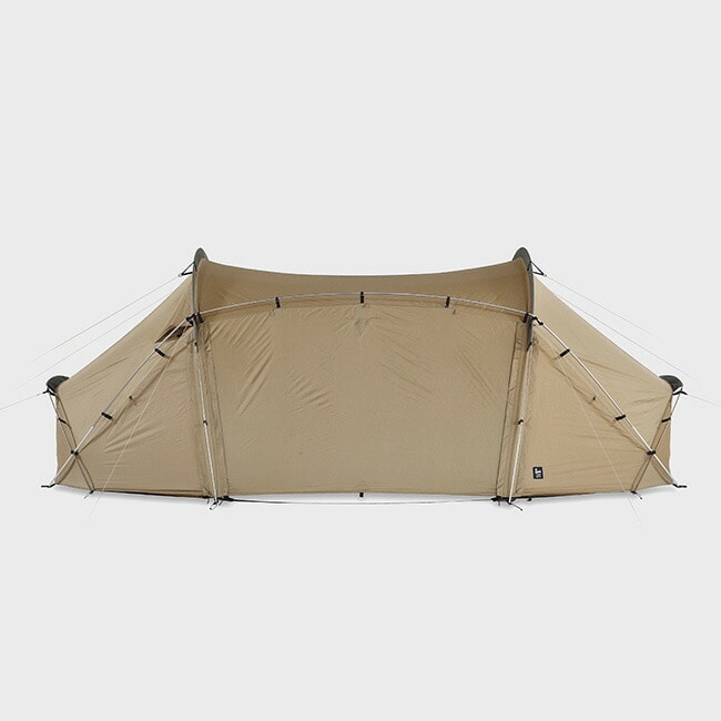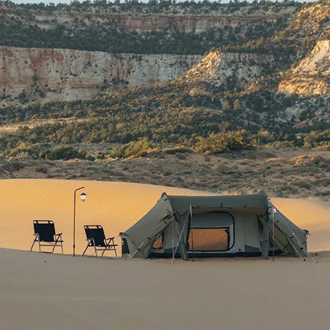 完全自立式のアウトフレーム構造で、地面にペグが打てない場所でも設営可能。