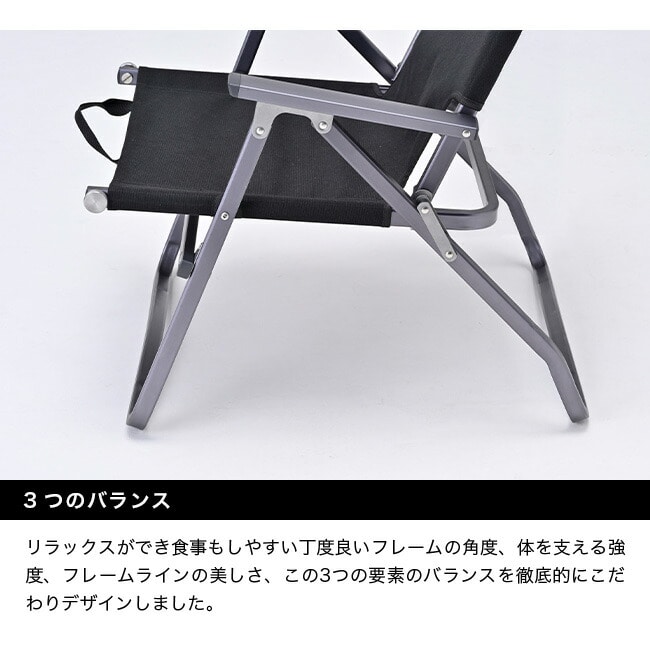 リラックスしやすい角度と安定感のあるフレーム設計により、キャンプやピクニック、フェスなどさまざまなシーンで安心して使用できます。