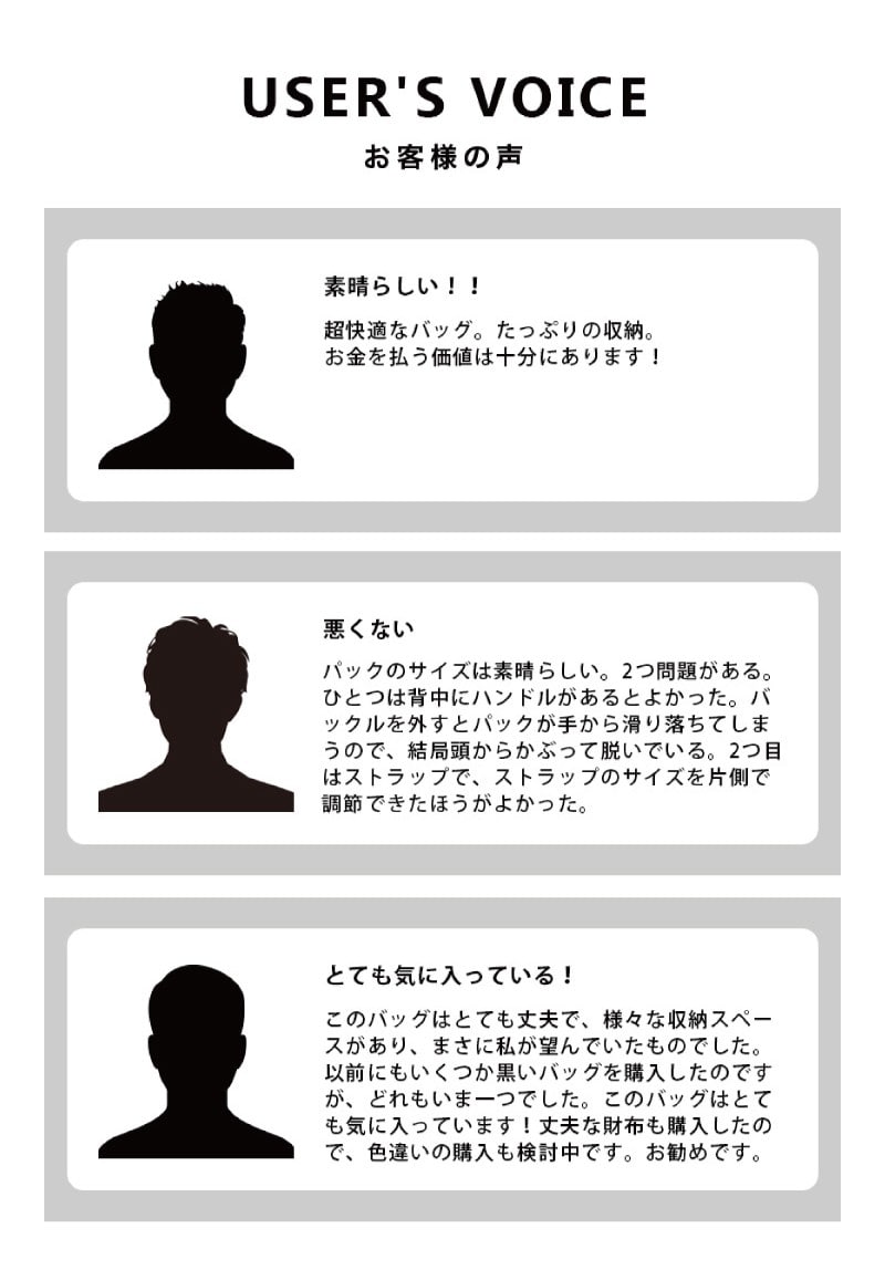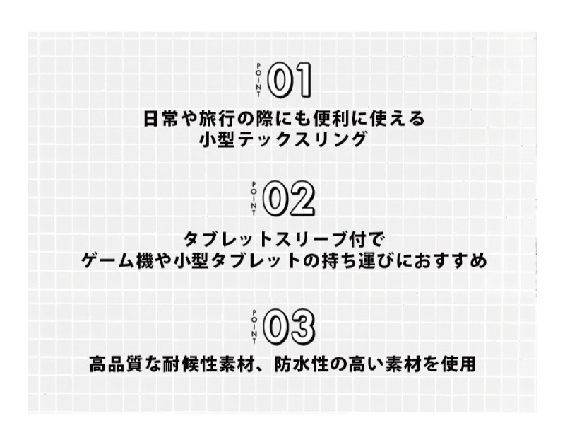 仕様 3つのメインコンパートメント(前面のクイックアクセスコンパートメント、メインコンパートメントにはポケットが2つ、後部コンパートメント)