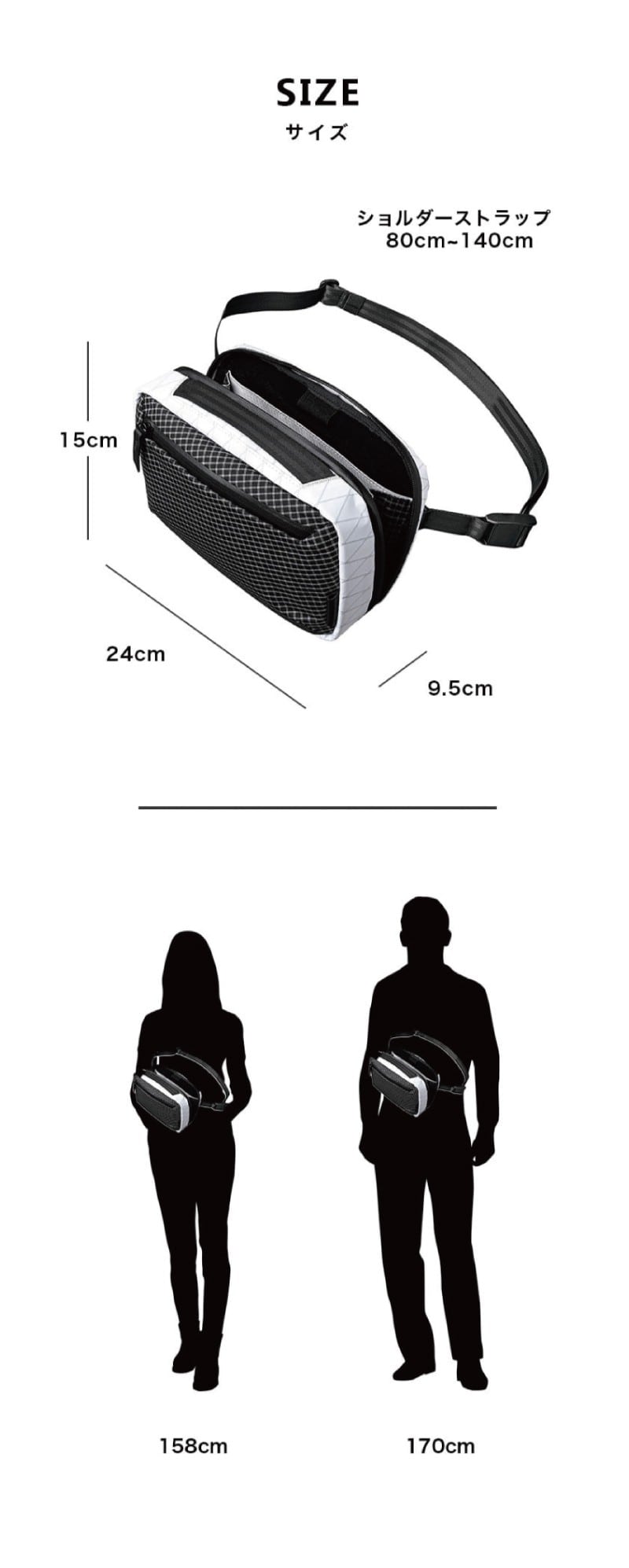 サイズ (約)[本体]タテ15cm×ヨコ24cm×マチ9.5cm、ショルダーストラップ 80cm-140cm