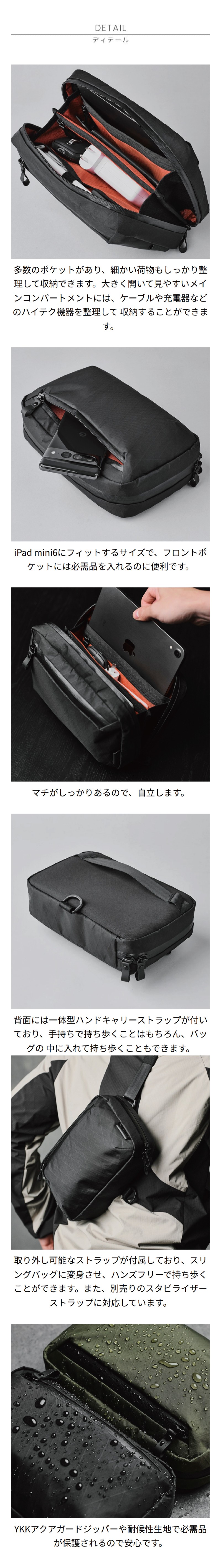 仕様 前面:ファスナーポケット×1、メインコンパートメント:ファスナーポケット×1(内側にオープンポケット×3)、ファスナーポケット×1、オープンポケット×3、ペンホルダー×1、背面:持ち手×1、取り外し可能ショルダーベルト×1
