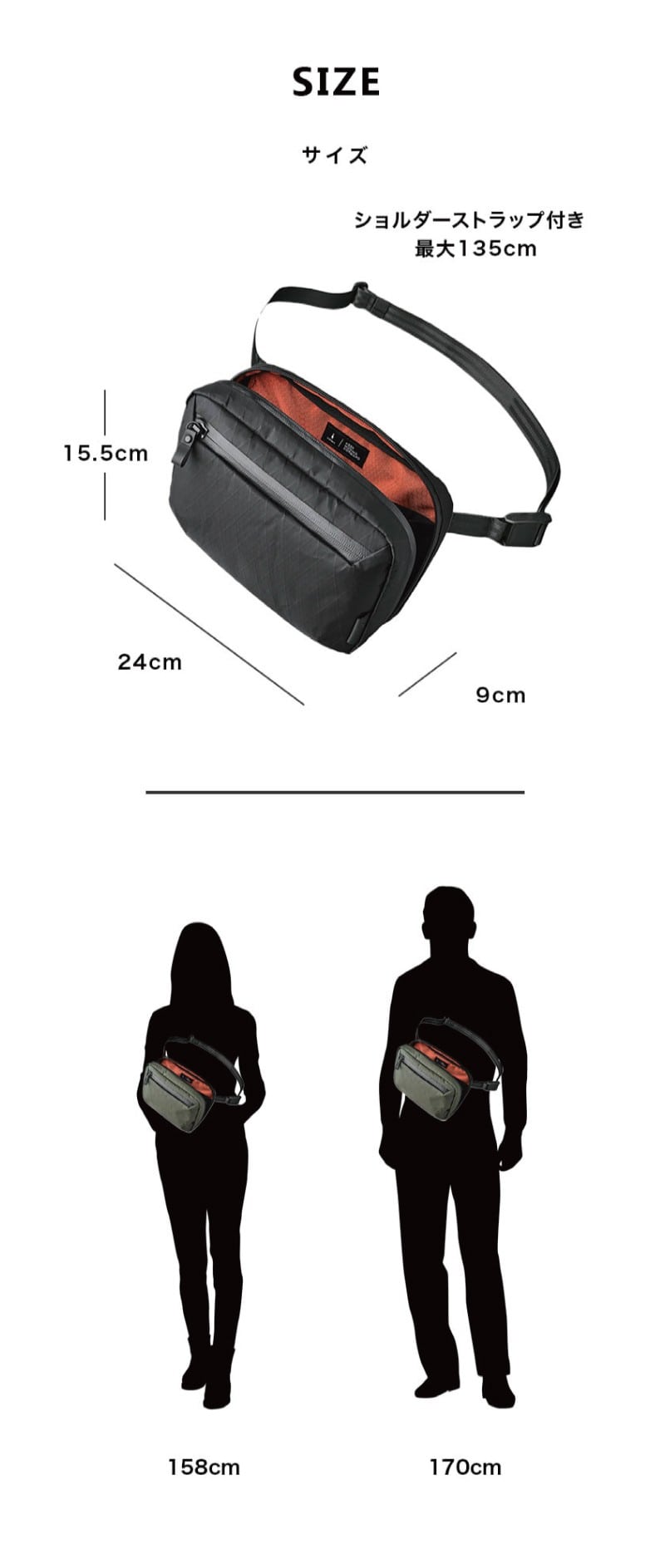サイズ (約)[本体]タテ15.5cm×ヨコ24cm×マチ9cm、ショルダーストラップ 最大135cm