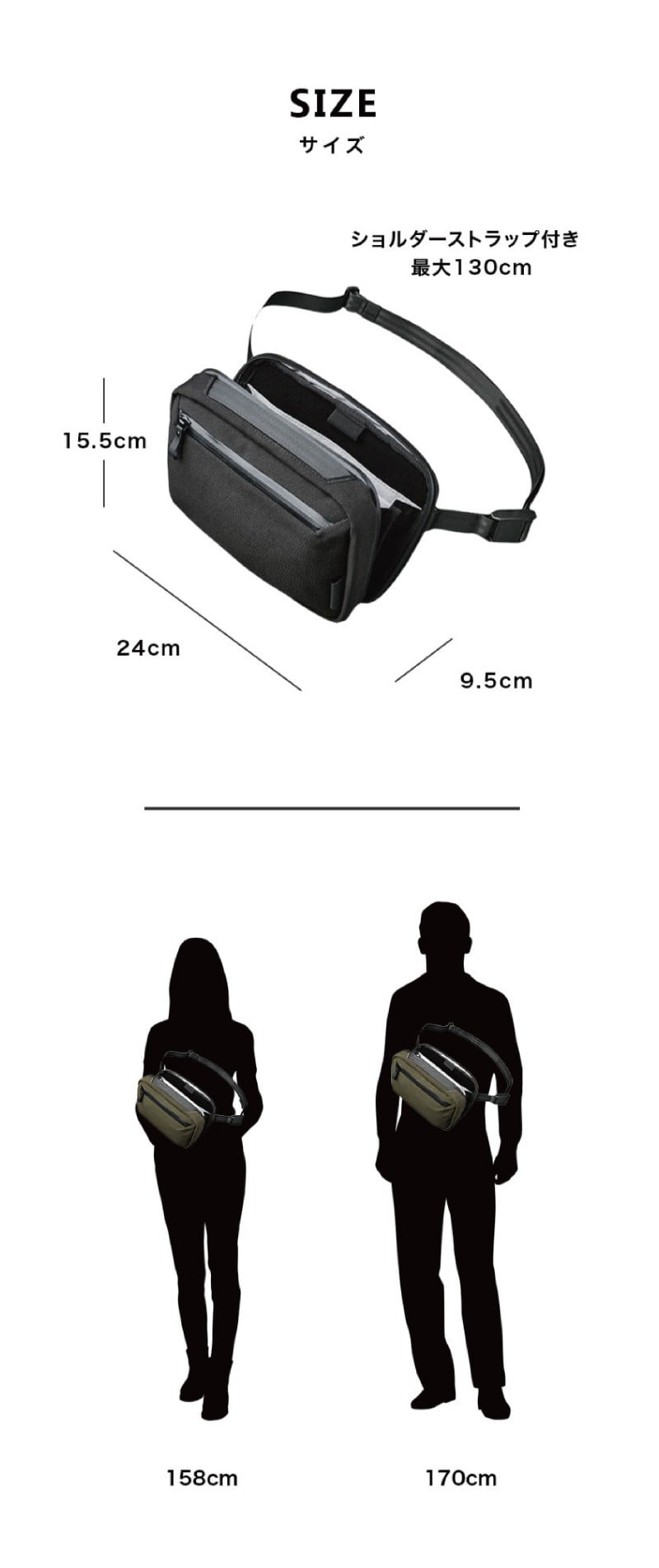サイズ (約)[本体]タテ15.5cm×ヨコ24cm×マチ9.5cm、ショルダーストラップ 最大130cm
