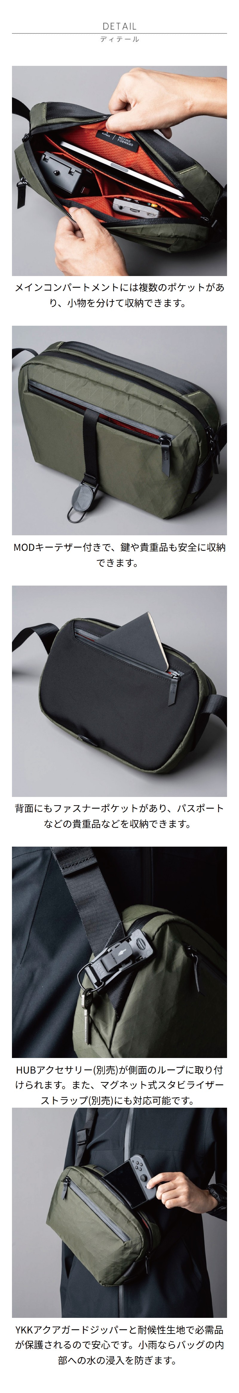 仕様 前面:ファスナーポケット×1(内側にオープンポケット×2)、MODキーテザー×1
