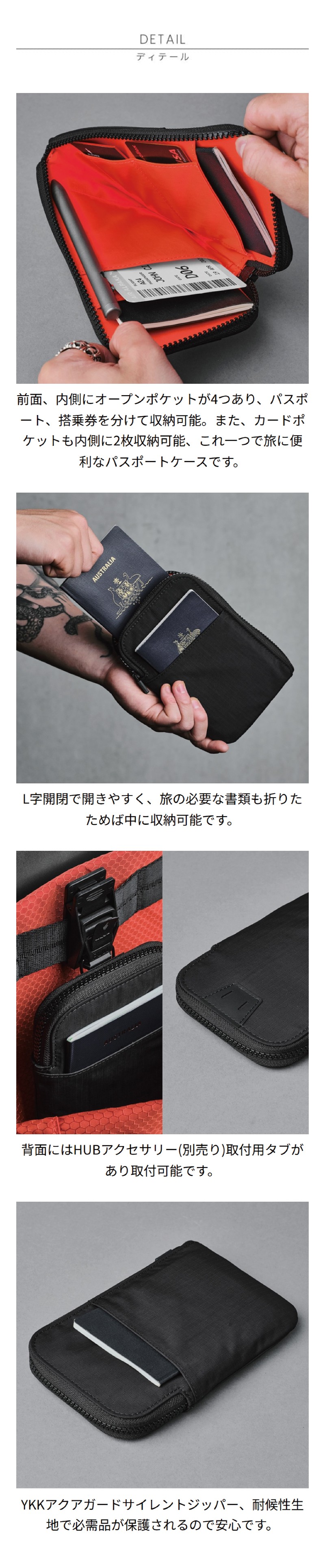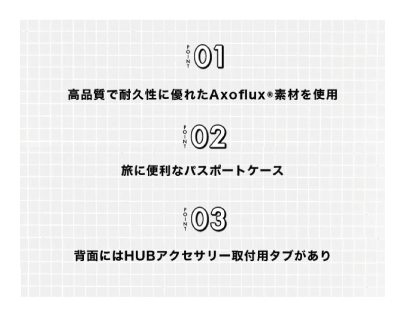 仕様 前面:オープンポケット×1、内側:カードポケット×2、オープンポケット×3、背面:HUBアクセサリー取付用タブ×1