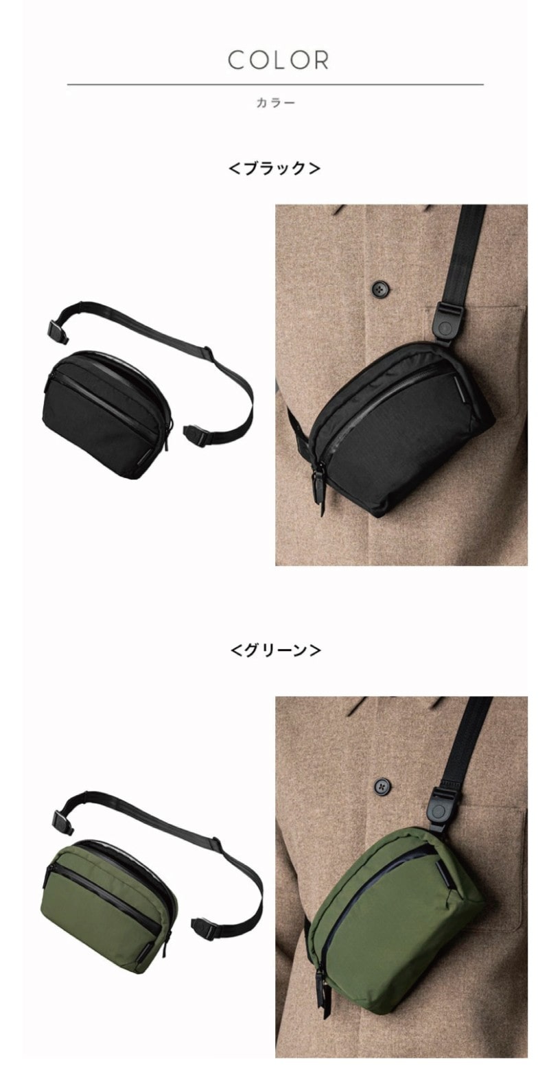 仕様 前面:ファスナーポケット×1(内側にMOD キーテザー×1)、内側:オープンポケット×3、背面:オープンポケット×1取り外し可能ショルダーベルト×1