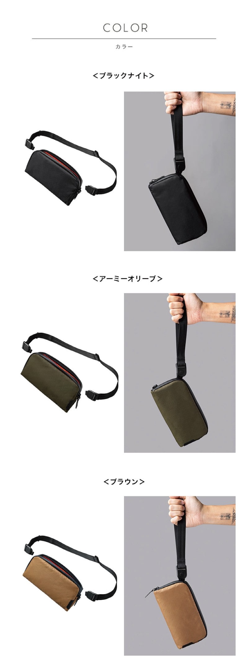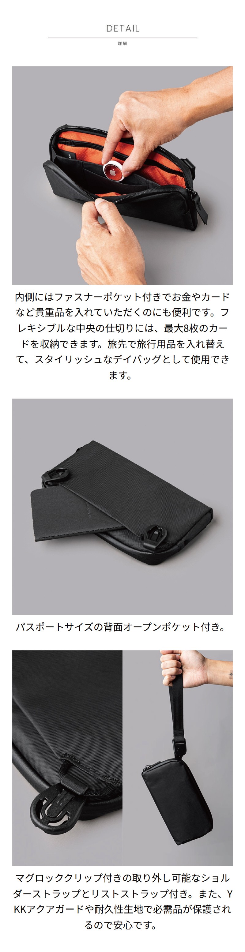 仕様 メインコンパートメント:ファスナーポケット×1、カードポケット×2、背面:オープンポケット×1、取り外し可能ショルダーベルト×1