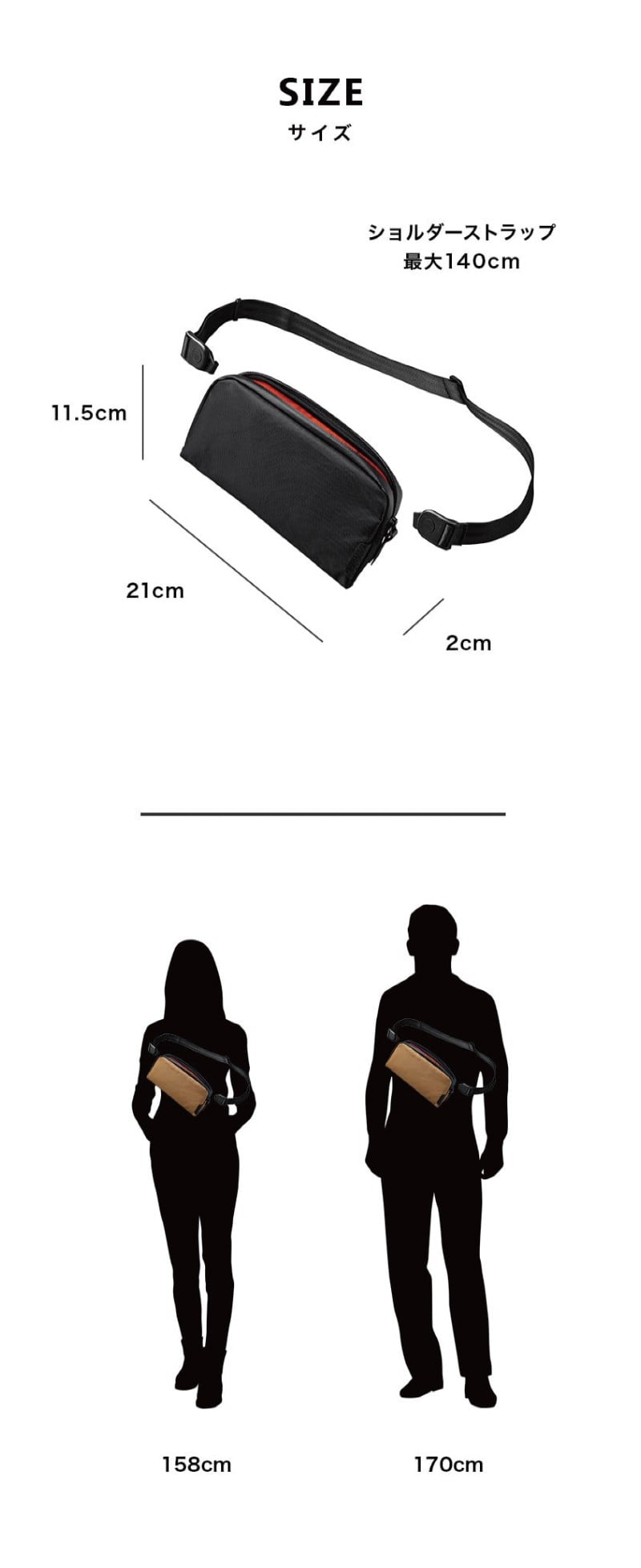 サイズ (約)[本体]タテ11.5cm×ヨコ21cm×マチ2cm、[ハンドストラップ]24.5cm、[ショルダーベルト]80~140cm
