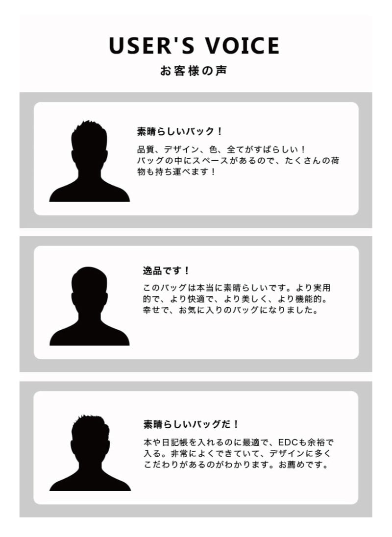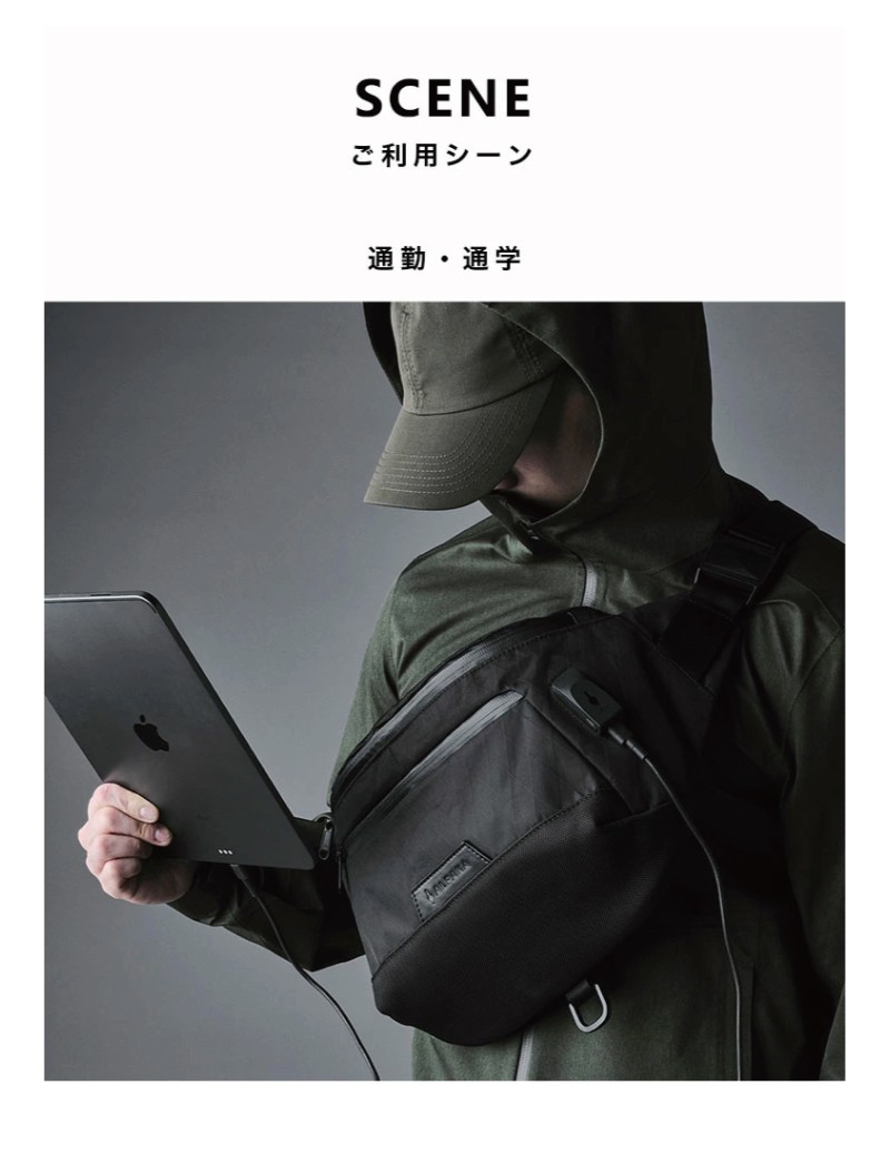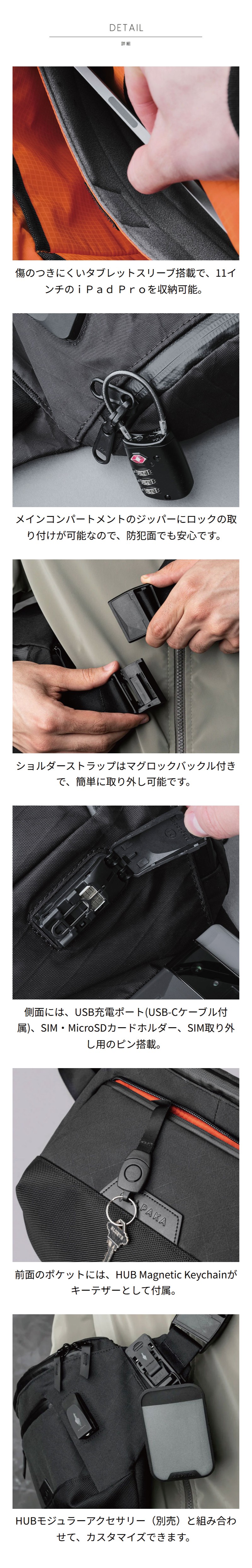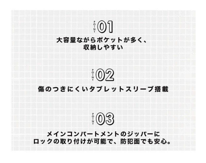 仕様 前面: ファスナーポケット ×1(内側にキーテザー × 1) メインコンパートメント(オープンポケット ×2、タブレットスリーブ × 1)