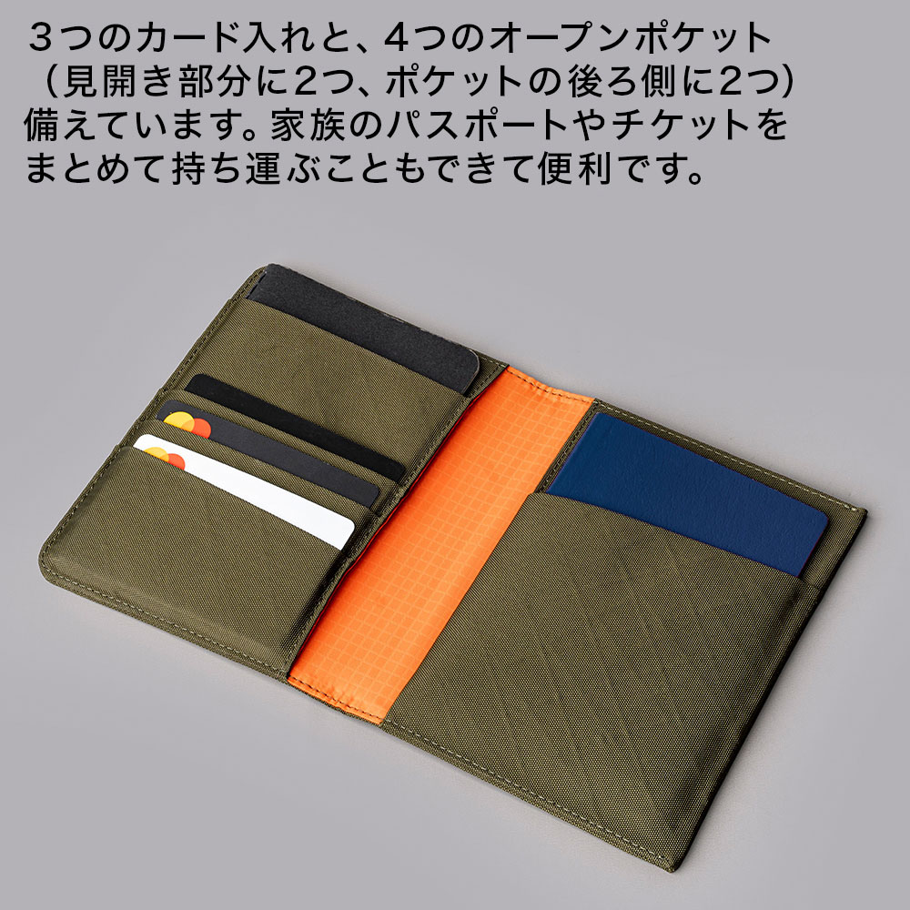 3つのカード入れと、4つのオープンポケット(見開き部分に2つ、ポケットの後ろ側に2つ)備えています。 家族のパスポートやチケットをまとめて持ち運ぶこともできて便利です。
