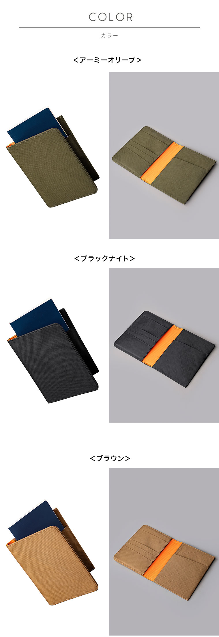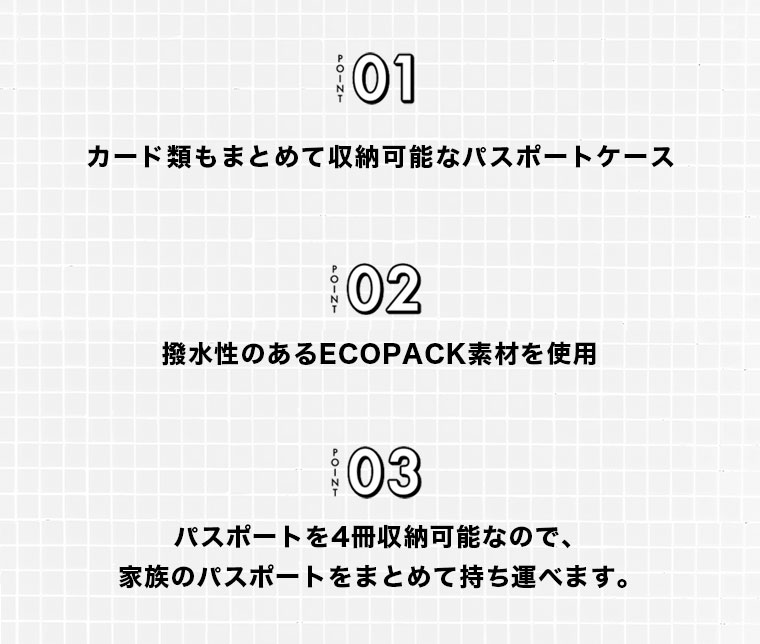 3つのカード入れと、4つのオープンポケット(見開き部分に2つ、ポケットの後ろ側に2つ)備えています。 家族のパスポートやチケットをまとめて持ち運ぶこともできて便利です。