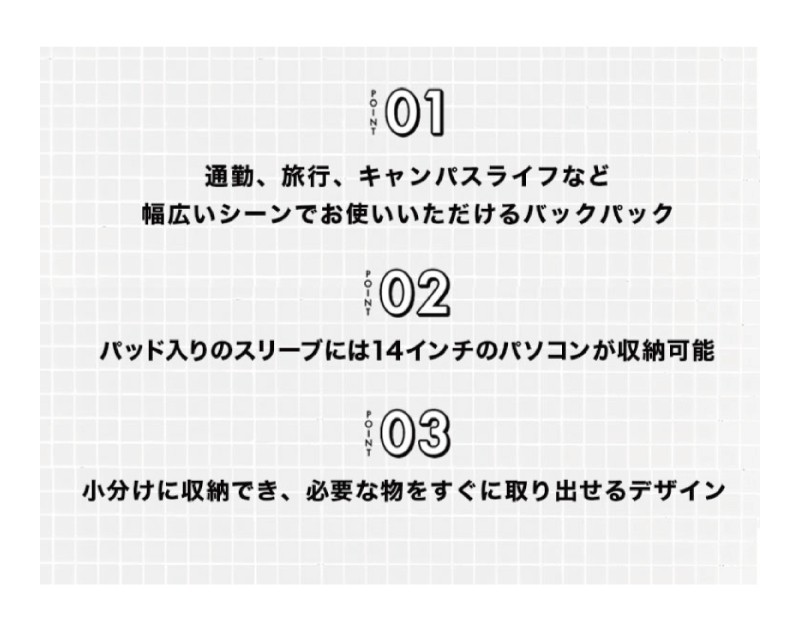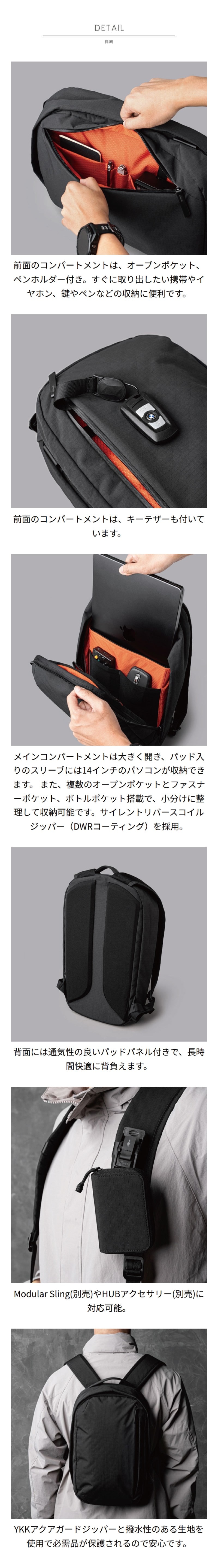 [メインコンパートメント]ラップトップ収納用ポケット(14インチまで)×1、オープンポケット×3、ファスナーポケット×1、ボトルポケット×1
