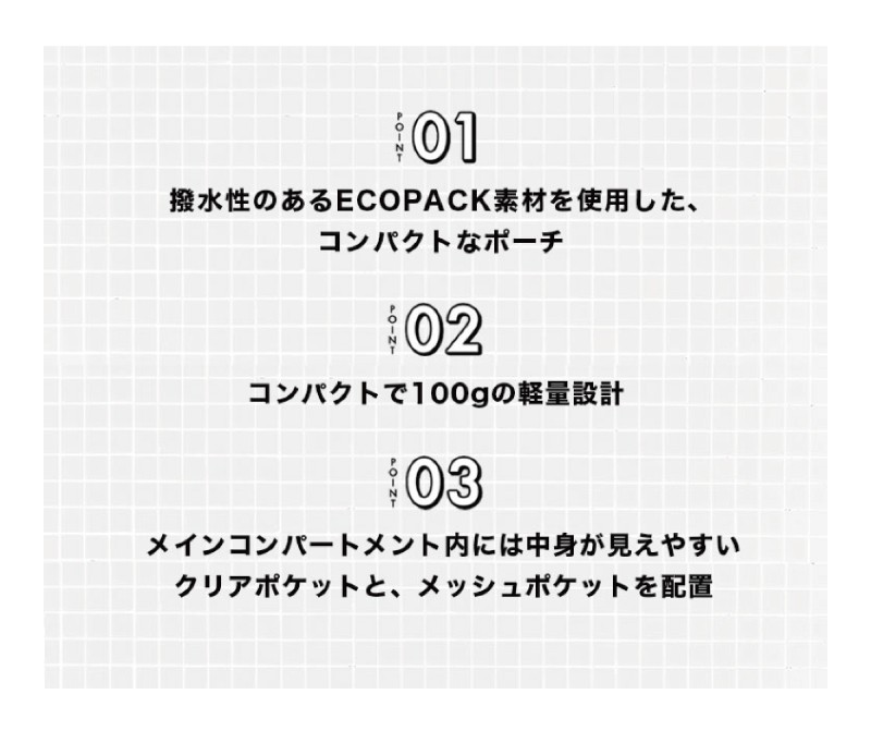 [メインコンパートメント]メッシュポケット×2、クリアポケット×1