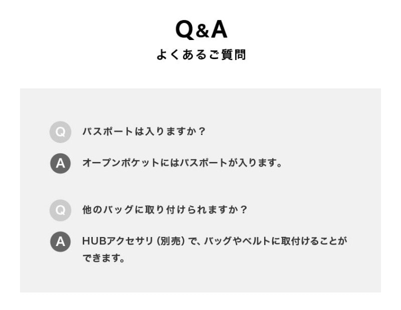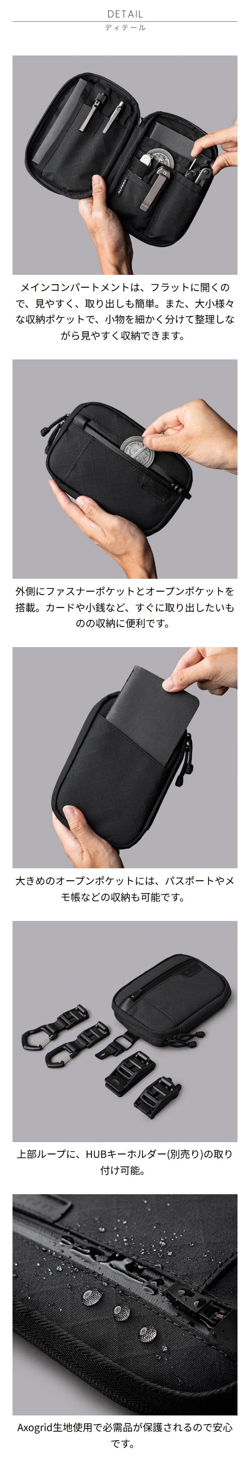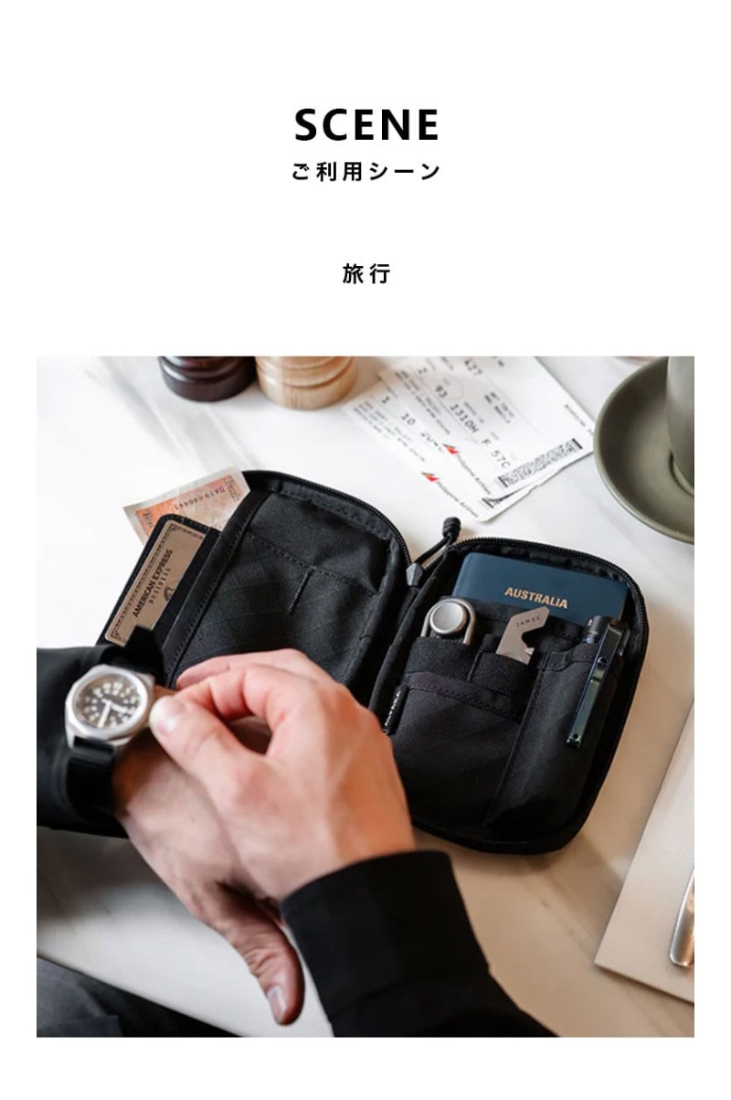 仕様 前面:ファスナーポケット×1、オープンポケット×1、背面:オープンポケット×1(パスポートサイズ)、内側:オープンポケット×2(パスポートサイズ)、小物収納用オープンポケット×5(内1個はゴムベルトで2箇所に分けて収納可能)、上部:取り付けループ×1