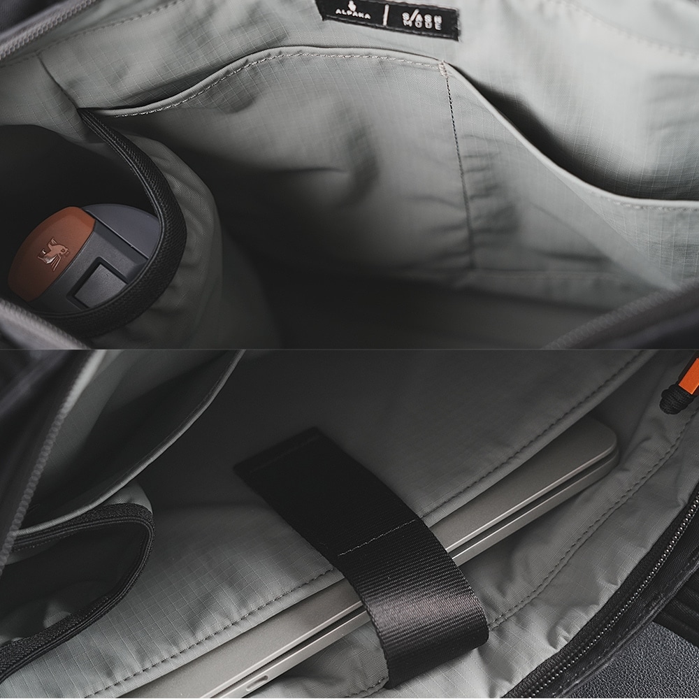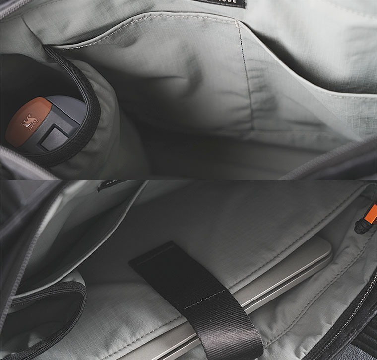 メインコンパートメントにはボトルホルダー、13インチのパソコン用スリーブ付き。