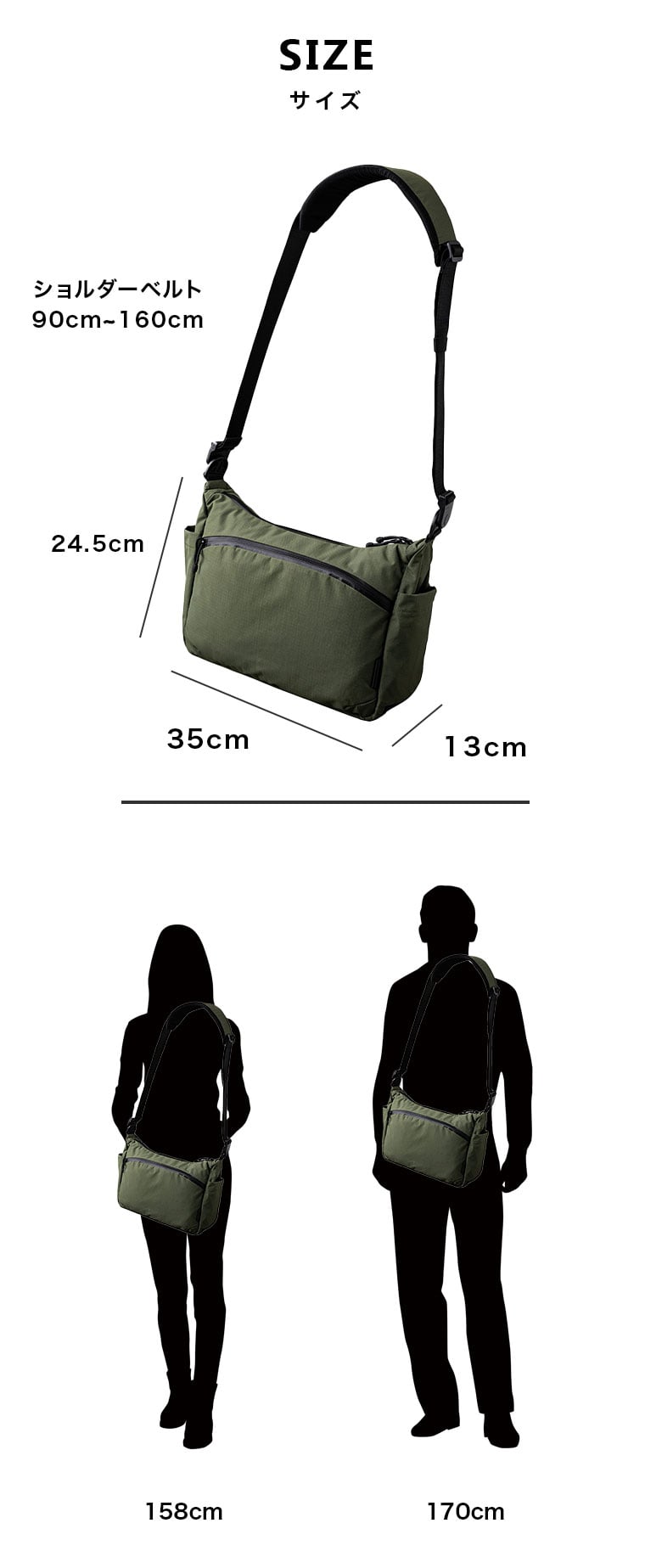 サイズ (約)[本体]タテ24.5cm×ヨコ35cm×マチ13cm、ショルダーベルト 90cm~160cm